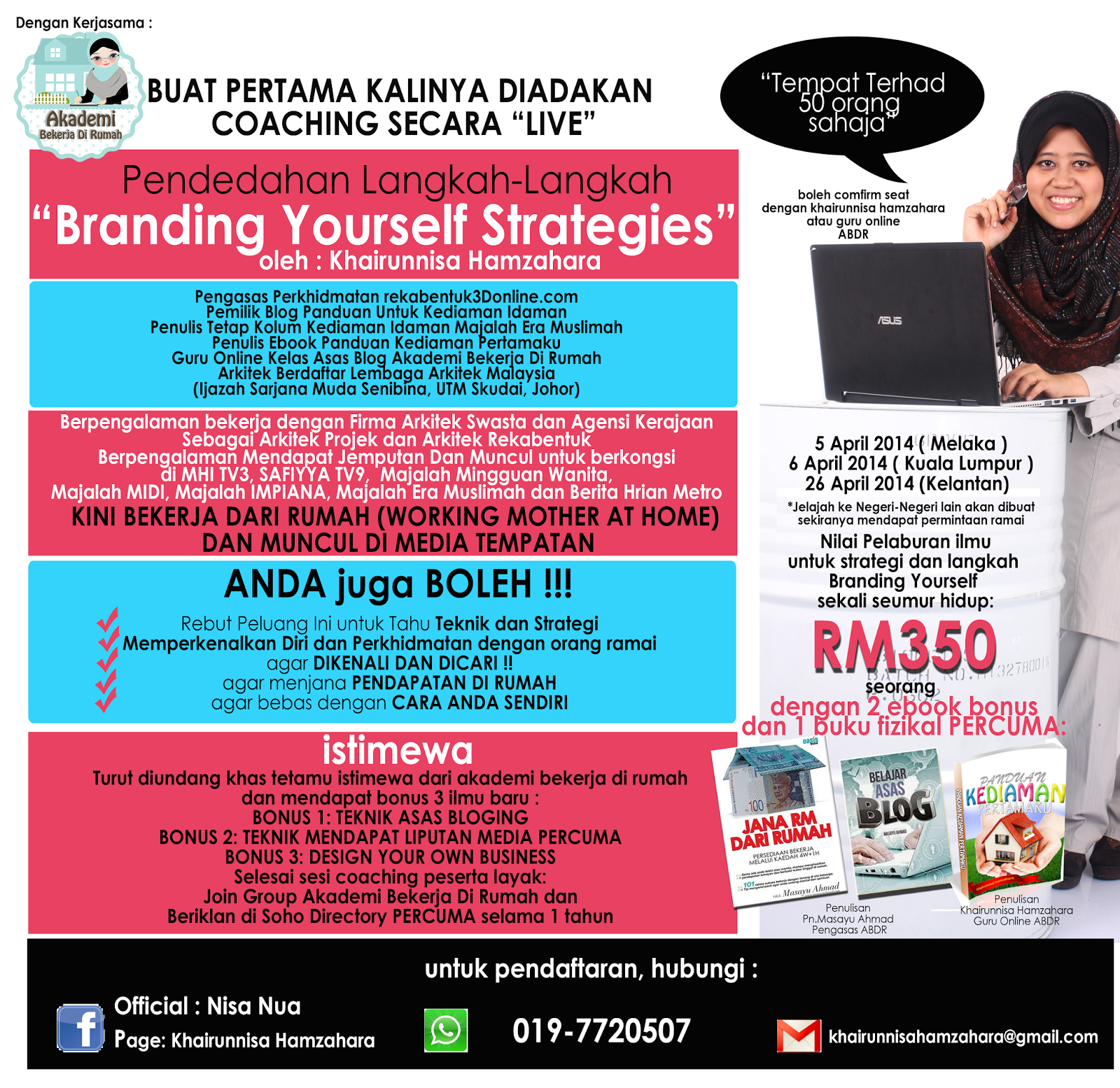 Anda lawyer ke, dokter ke, arkitek ke, pensyarah ke, penulis ke, tukang ukir ke, tukang jahit baju ke, cikgu tuisyen ke, pembekal produk ke, pemilik syarikat ke atau apa saja, semuanya perlu tahu cara untuk brandingkan diri dan bisnes masing-masing.